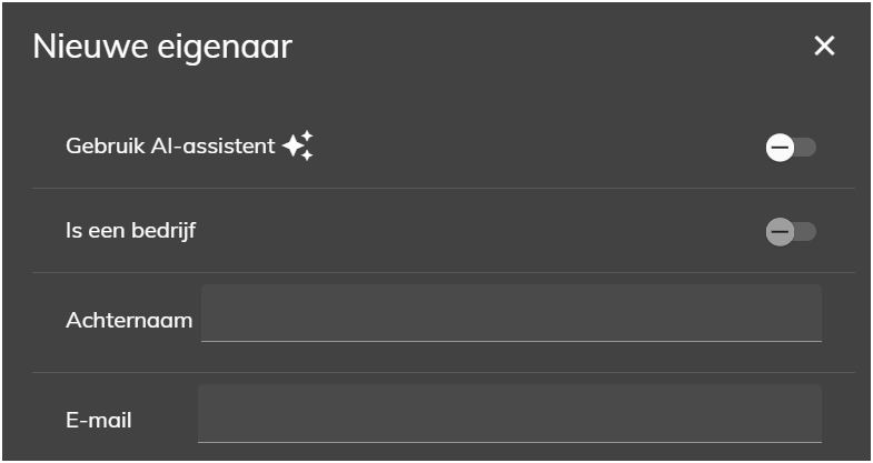 Er opent een venster waar je de persoonsgegevens van de eigenaar kunt invoeren. Je kunt hier zelf de gegevens invoeren of wanneer je gegevens wilt kopiëren/plakken kun je kiezen voor het gebruik van de AI-assistent.