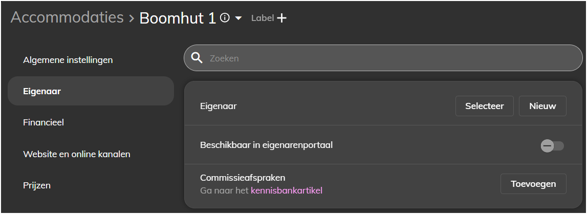 Dit doe je door naar het menu Accommodaties te gaan en de betreffende accommodatie te openen. Hier kun je een eigenaar selecteren (of direct een nieuwe eigenaar aanmaken).