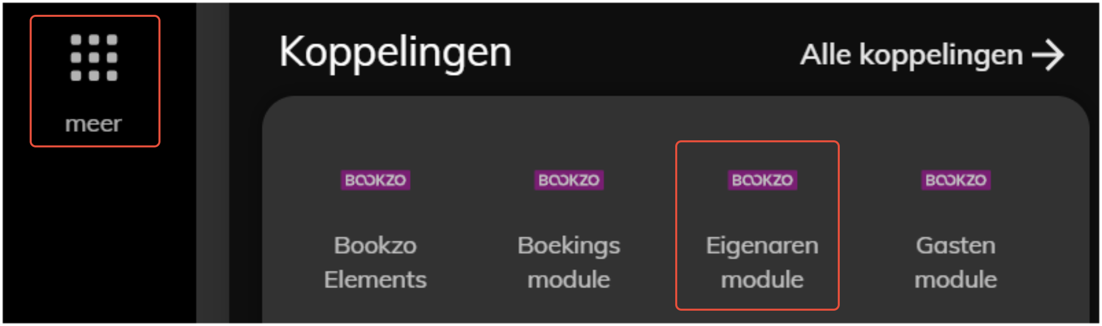 Wil je dat de eigenaar de reviews kan inzien dan kun je dit instellen in de eigenarenmodule. Hiervoor ga je naar het menu Meer - Koppelingen - Eigenarenmodule.
