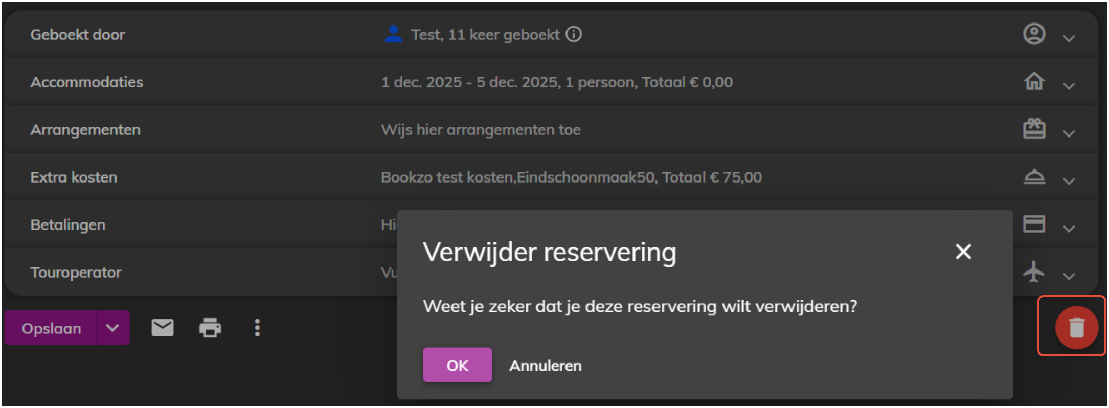 Wil je een reservering verwijderen dan open je de reservering en klik je op het prullenbakje, deze zie je halverwege het scherm aan de rechterkant. Voordat je de reservering definitief kunt verwijderen, krijg je eerst nog een melding naar voren.