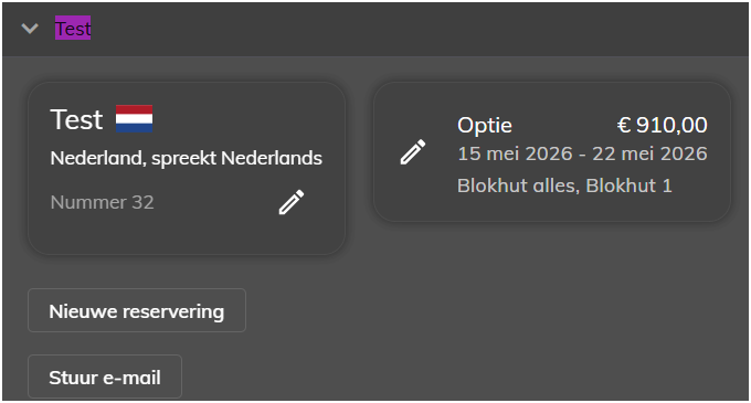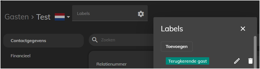 Wanneer je, in de reservering, op het pennetje klikt naast de gastnaam kom je in een menu waar je de gastgegevens kunt aanpassen. Hier kun je eventueel ook labels aan de gast toekennen, memo's of waarschuwingsberichten invoeren.