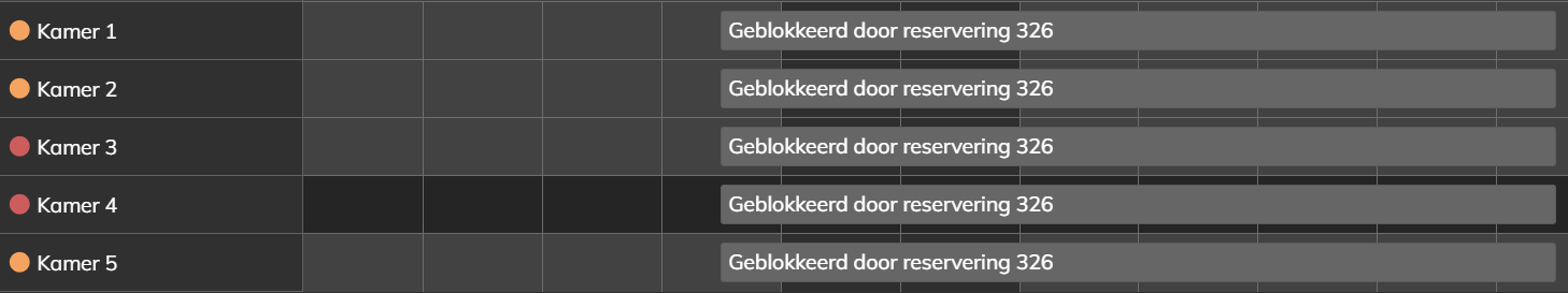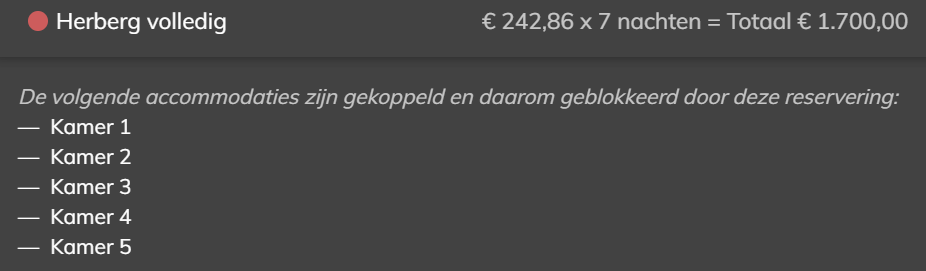 Dus wanneer de Herberg in zijn geheel wordt verhuurd, blokkeren de Kamers 1 t/m 5 en wanneer bijvoorbeeld Kamer 4 wordt verhuurd, zal de Herberg geblokkeerd worden omdat deze nu niet meer in zijn geheel te huren is.