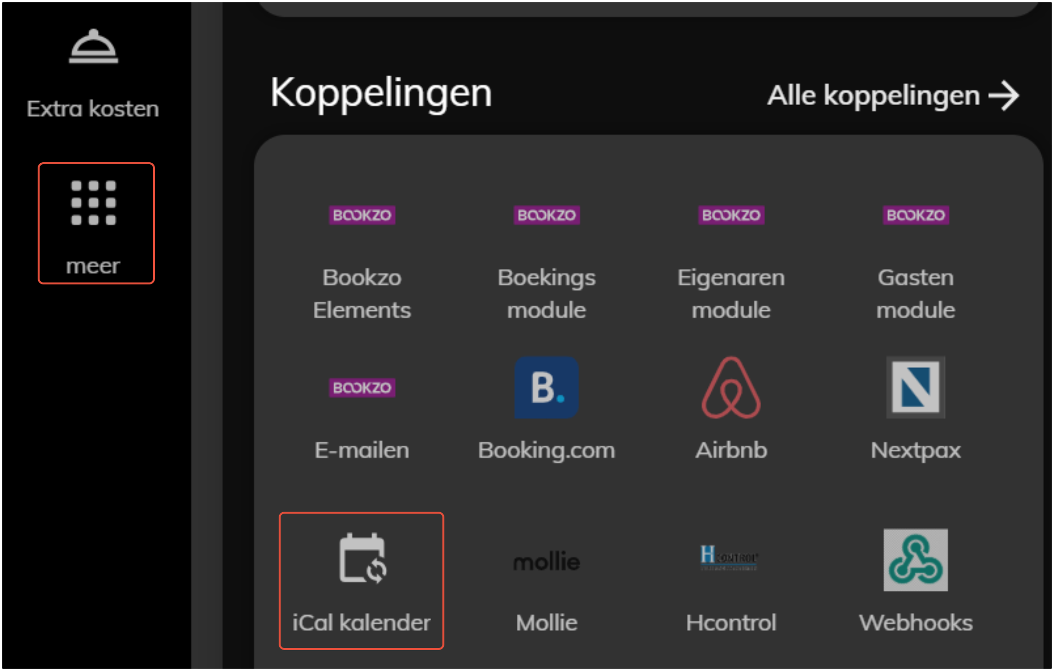 Hiervoor ga je naar het menu Meer - Koppelingen en zoek je op 'iCal kalender'.