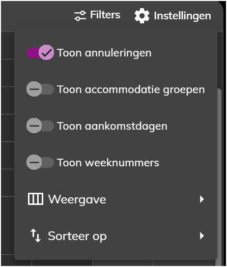 Om dit aan te zitten klik je rechts bovenin het planbord op 'Instellingen' en zet je het toggeltje om bij 'Toon annuleringen'.