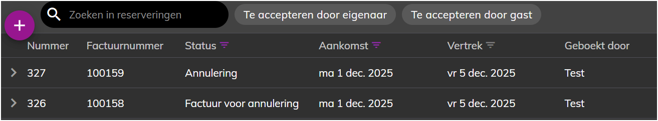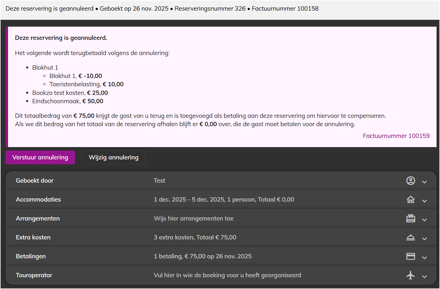 Dit is de originele reservering, de status is gewijzigd van Factuur naar Factuur voor annulering.