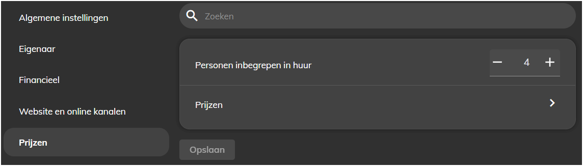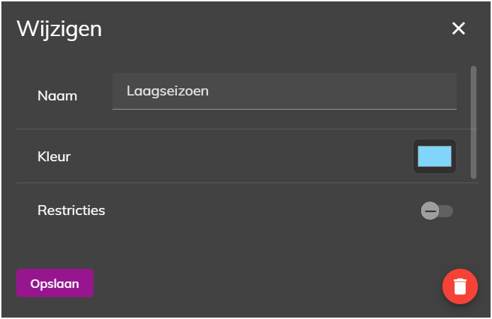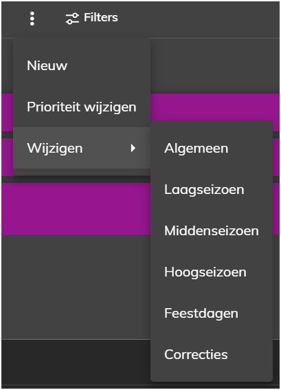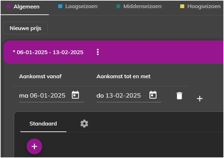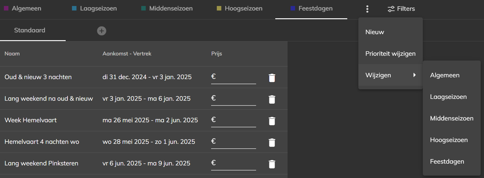 Je kunt zelf prijslagen aanmaken met bijvoorbeeld vakanties of voor laag-, midden- en hoogseizoen. Deze kun je zelf indelen. De prijslaag die het meest rechts staat ligt bovenaan.