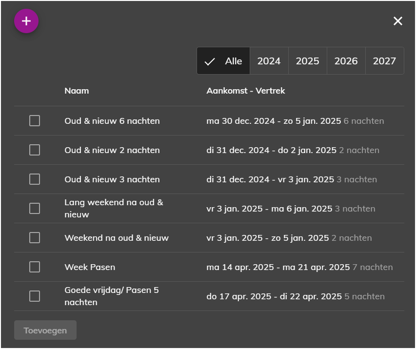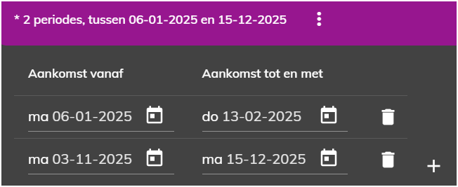 | Om een verblijfsperiode aan te maken klik je onder Standaard op het paarse plusje. Klik in de pop-up aan welke verblijfperiodes je wilt toevoegen. |