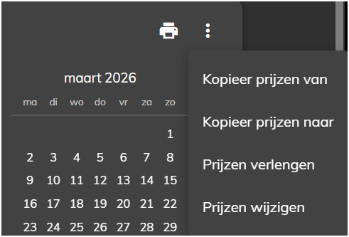 Vanuit de kalender kun je ook prijzen verlengen naar volgend jaar. Hiervoor klik je ook op de 3 puntjes en kies je voor 'Prijzen verlengen'.