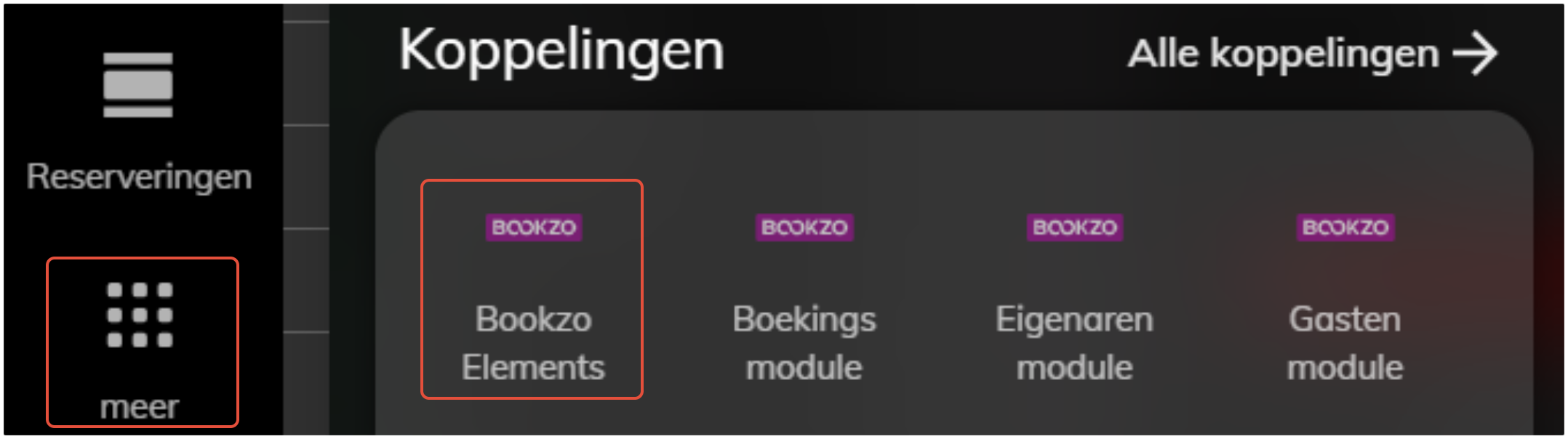 Hiervoor ga je naar Bookzo Web en kies je voor het menu Meer - Koppelingen. Hier zie je Bookzo Elements staan, klik op instellen;