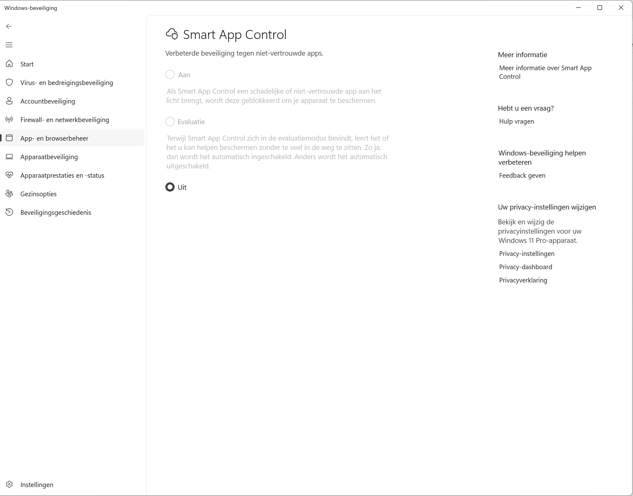 Wanneer Smart App Control wordt uitgeschakeld kan deze meestal niet opnieuw worden ingeschakeld zonder Windows opnieuw te installeren.